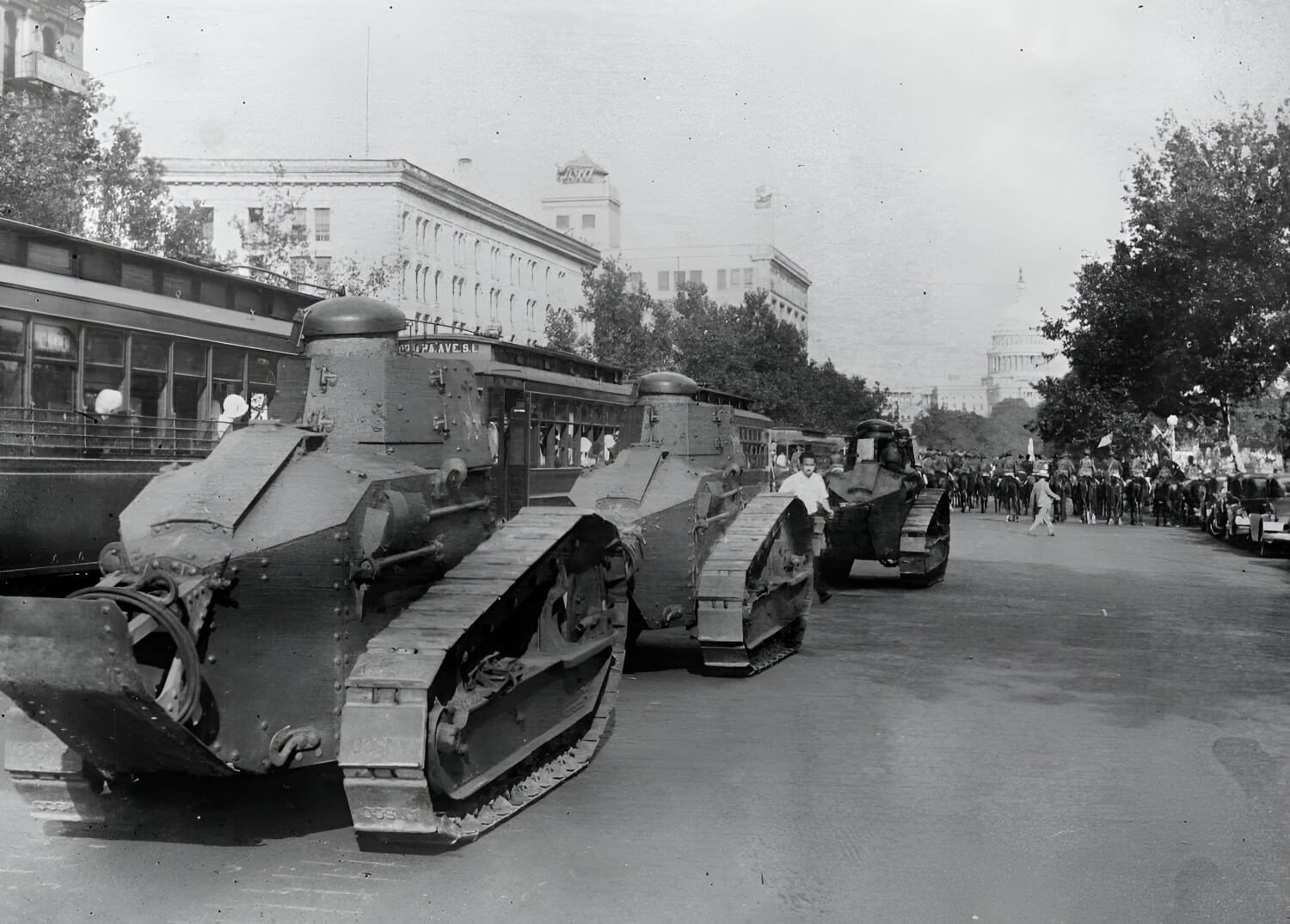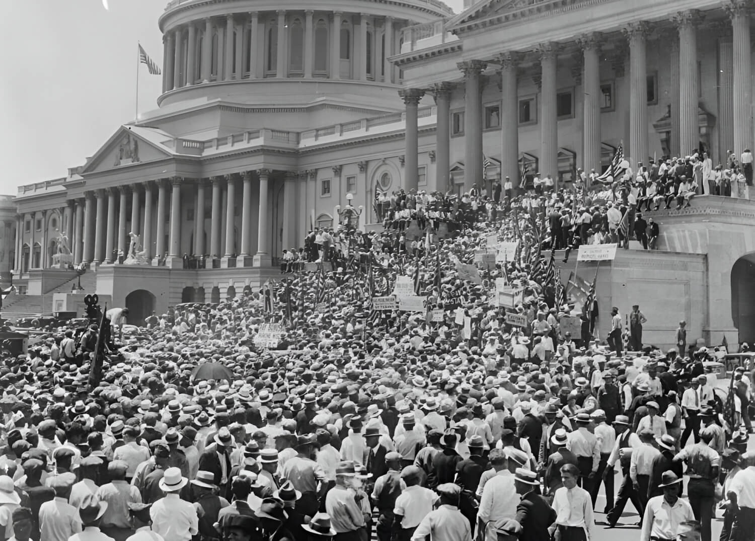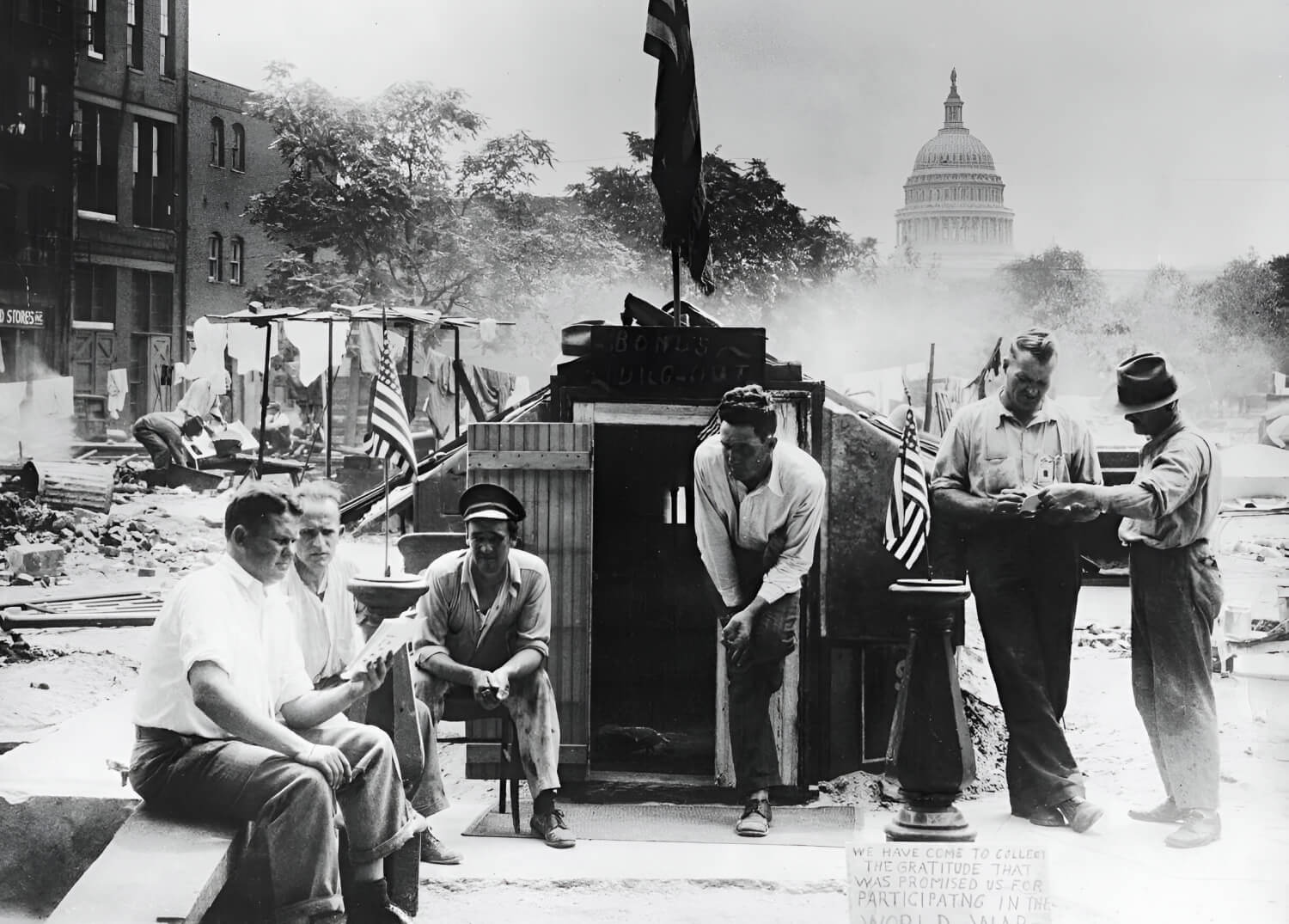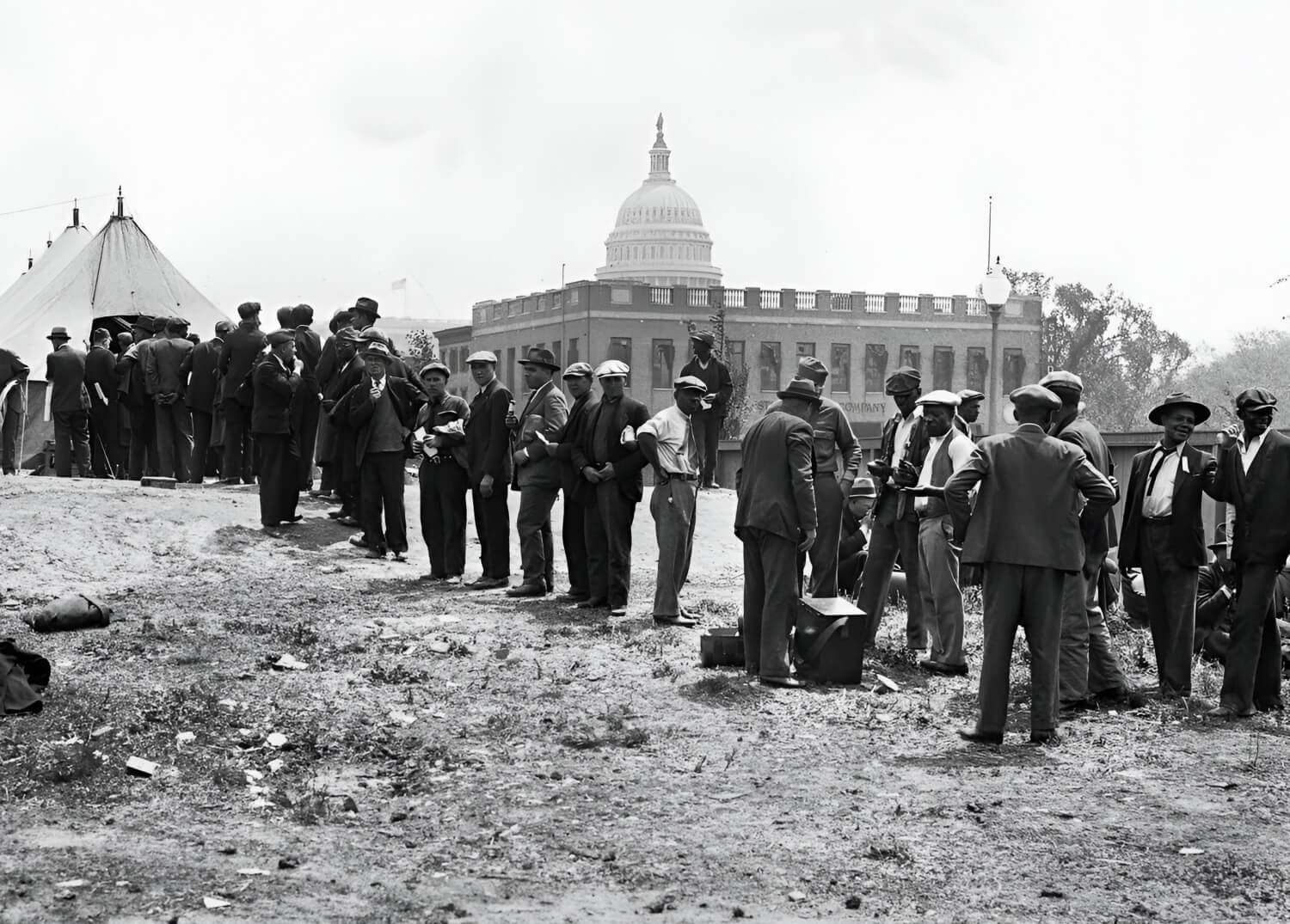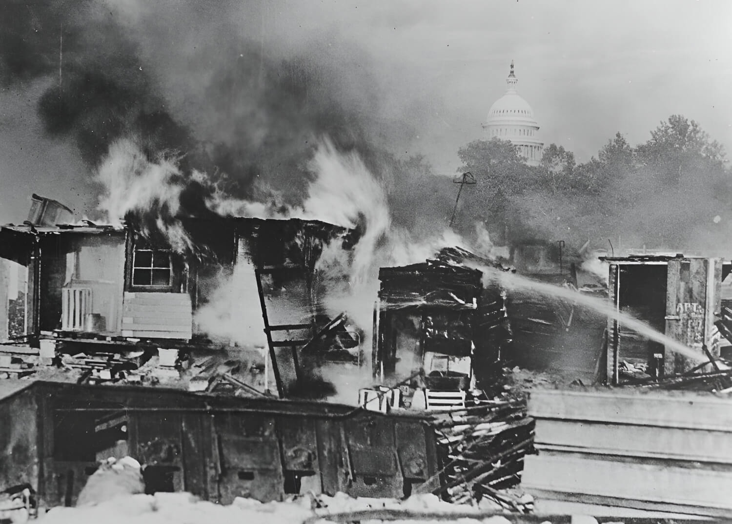 In 1932, a crowd of 20,000 World War I veterans marched on the Capitol in Washington. They were demanding the bonuses they’d been promised for their military service, which is why they were dubbed the “Bonus Army.” Not far from the Capitol, the veterans set up a tent camp, which, on President Hoover’s orders, was dispersed with tear gas, then crushed by tanks and set on fire.