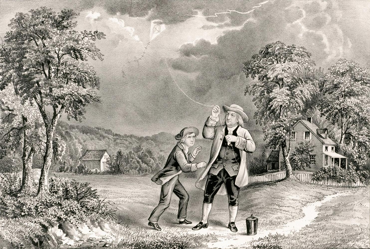 Back in 1752, Franklin carried out his famous lightning experiment. He was the first to figure out that lightning wasn’t some sort of divine punishment, but an electrical spark — the same kind you get when you rub amber on fur, just on a gigantic scale. In his day, that theory sounded like genuine madness, and to prove it, Franklin devised a clear visual experiment. He built a kite with a metal rod attached to the top, and tied an ordinary iron key to the lower end of the string. He flew this kite during a thunderstorm. At the height of the storm, Franklin brought his finger close to the key, and a spark flashed between his finger and the key.