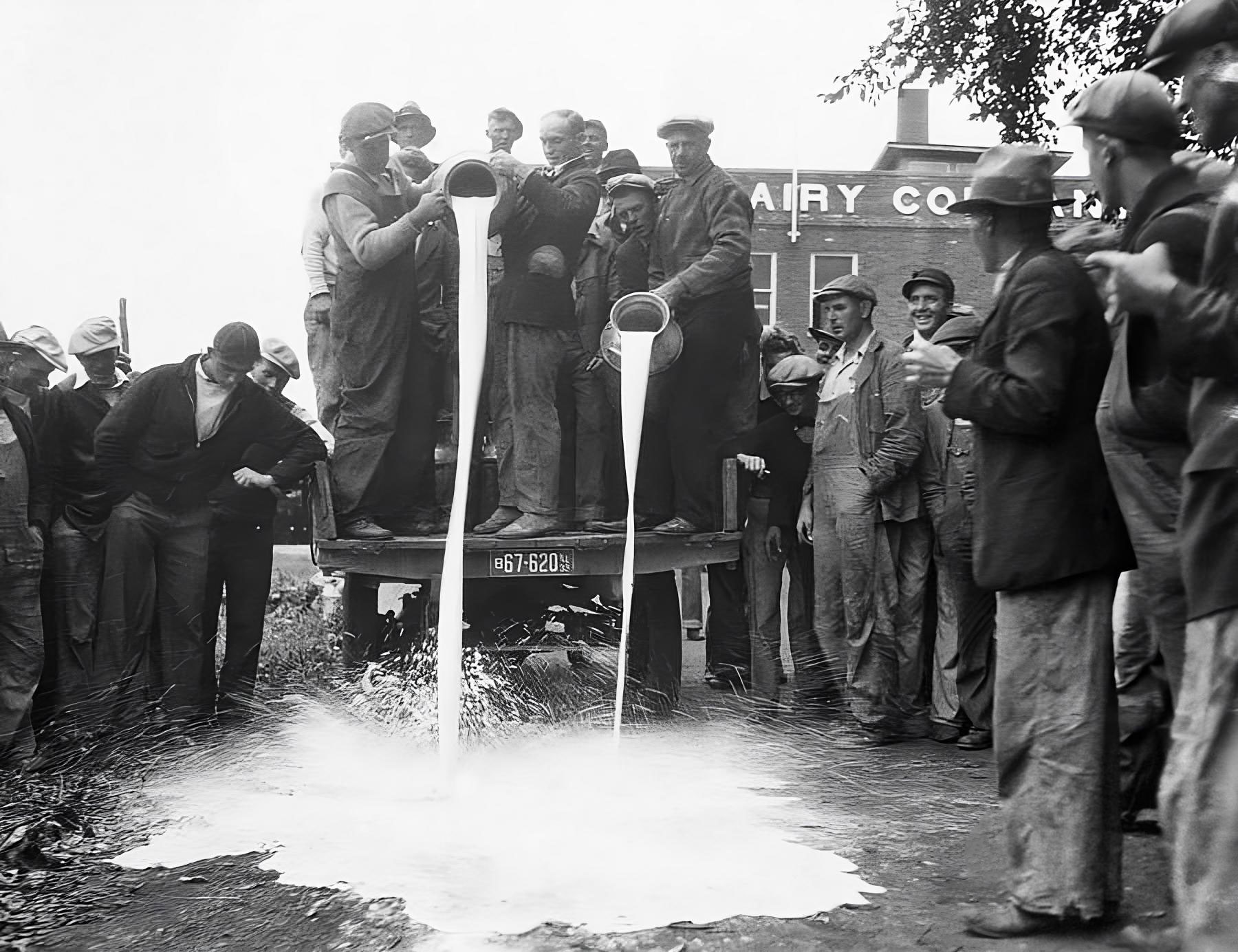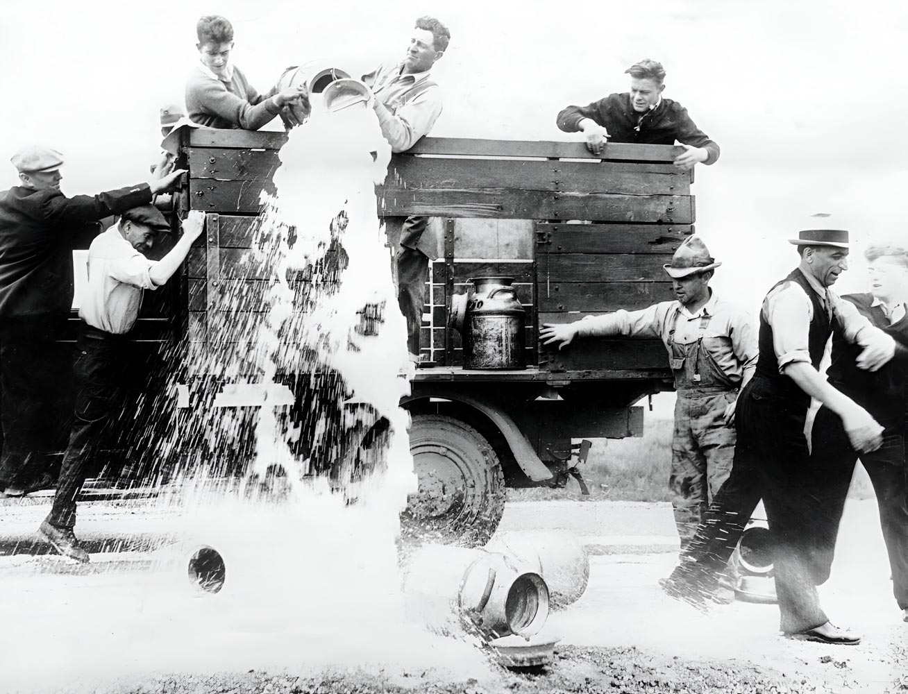 When they found out about this, the dairy farmers revolted. But not out of pity for the animals. On the contrary, they were outraged that everyone else got money and they didn’t! That’s when the milk strikes started in America. Farmers would haul milk into the city center and pour it right out onto the street, demanding payment so they’d stop.