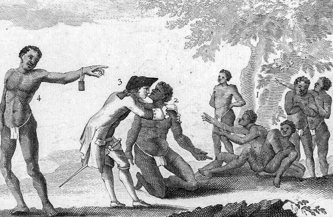 An Englishman checks a slave’s health by licking his face. The low saltiness of the sweat was thought to indicate a poor specimen