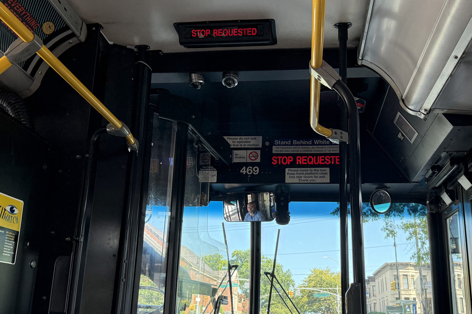 The cutest detail is the signal cord on the bus. All over the world, you press a STOP button to request a stop, but in American buses, there’s a cord running along the length of the cabin. To request a stop, you have to pull this cord. It used to ring a real bell, but now a sign lights up above the door instead. Pulling the cords is a whole ritual. The author has fallen so in love with them that I never press the button anymore.