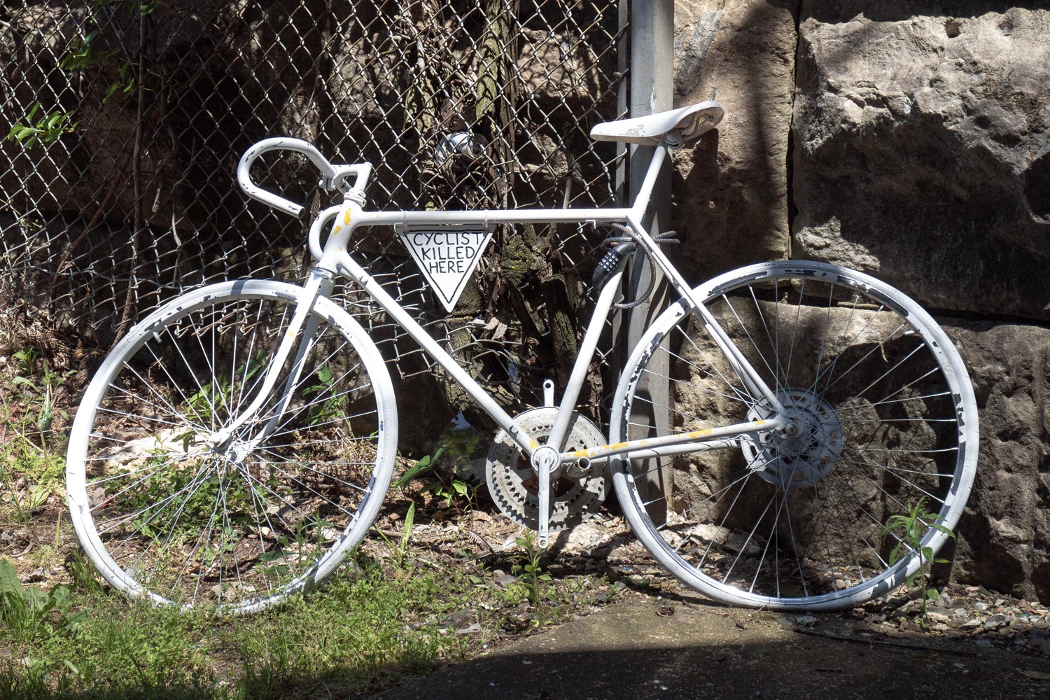 The most interesting thing was found under the bridge. A bicycle was leaning against the wall with a sign: “Cyclist killed here.”