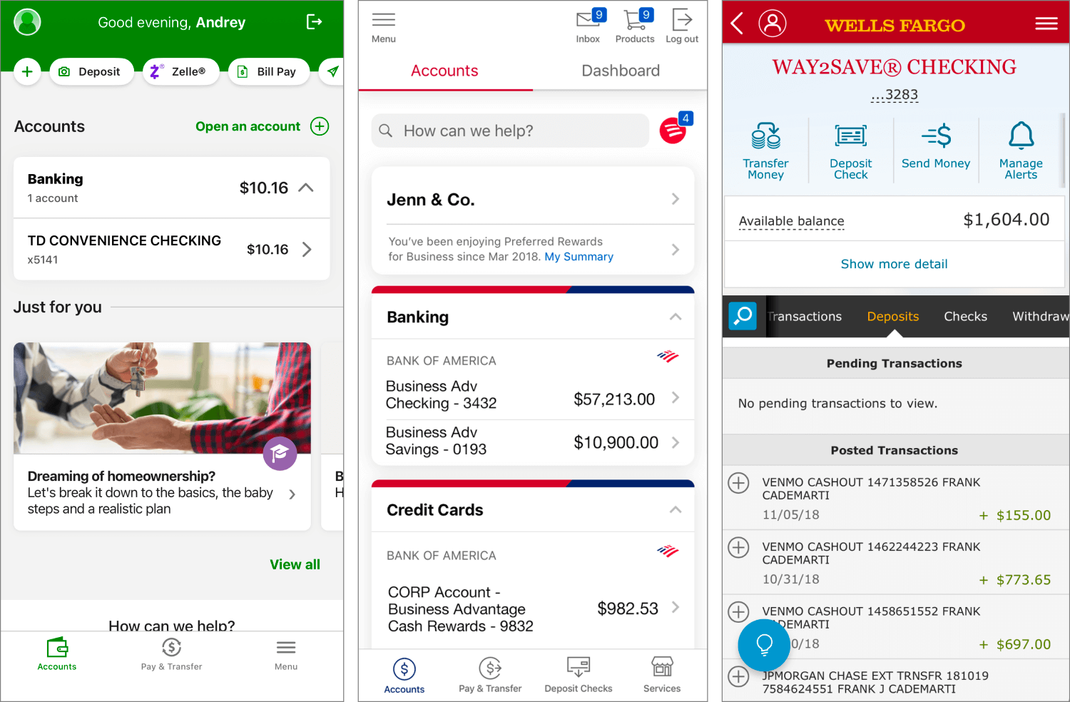 The author has tried five banks. The only one with a decent design was Chase. The rest, including TD Bank, which advertises how convenient it is, are a fall from grace in terms of design. The Bank of America and Wells Fargo apps could give any Russian a heart attack. They aren’t really apps at all, but web pages squeezed into a phone screen.