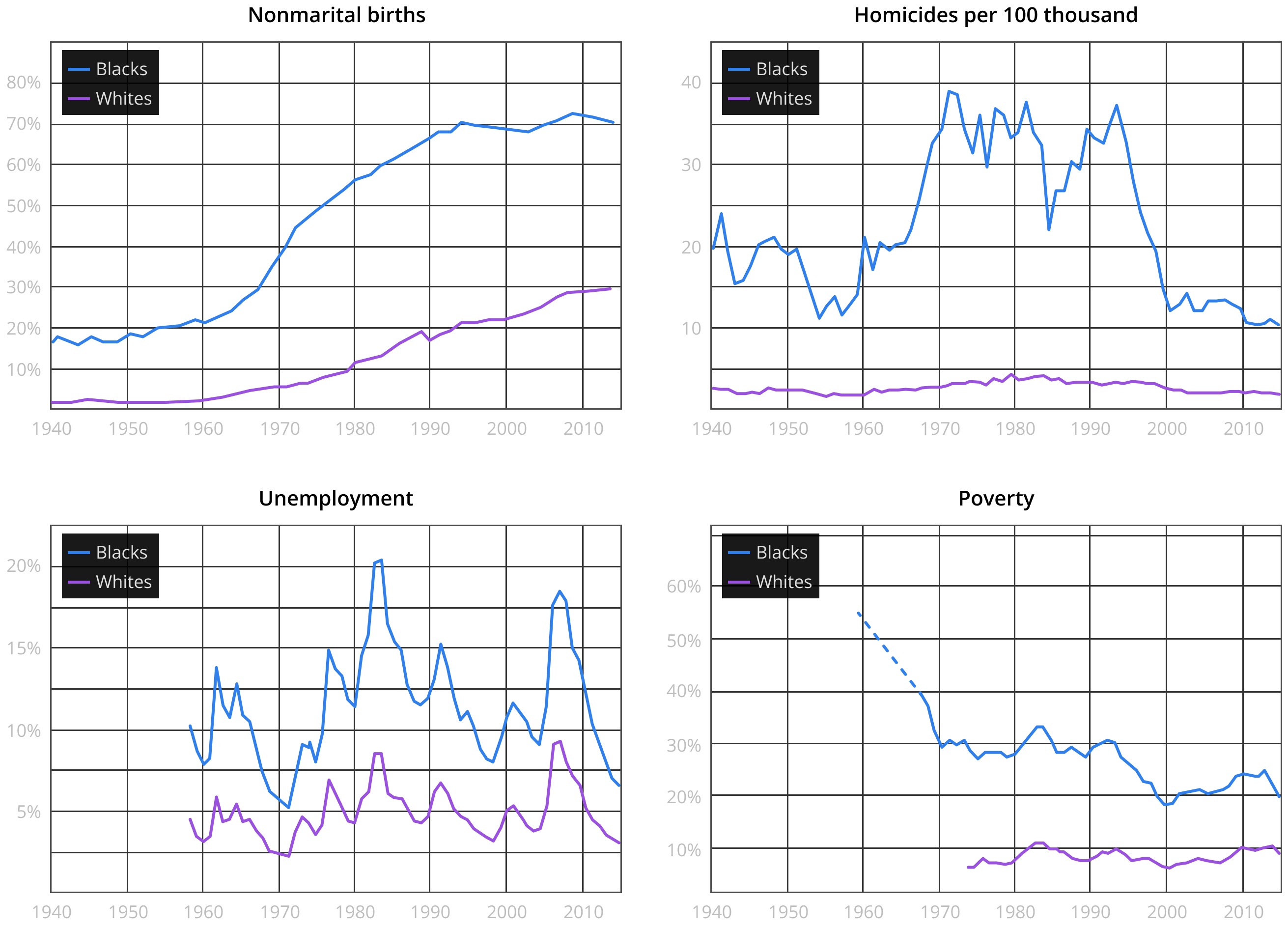 Who lives in places like this? There are two answers to that question. The first is obvious: people at the bottom of the social ladder — urban poor and the unemployed, with plenty of outcasts, drug addicts, and criminals among them. The second answer is much less comfortable, though it hasn’t been a secret for long. Most of these neighborhoods are black. Alas! If you overlay a map of Black America on a crime map, you’ll see they almost perfectly match .