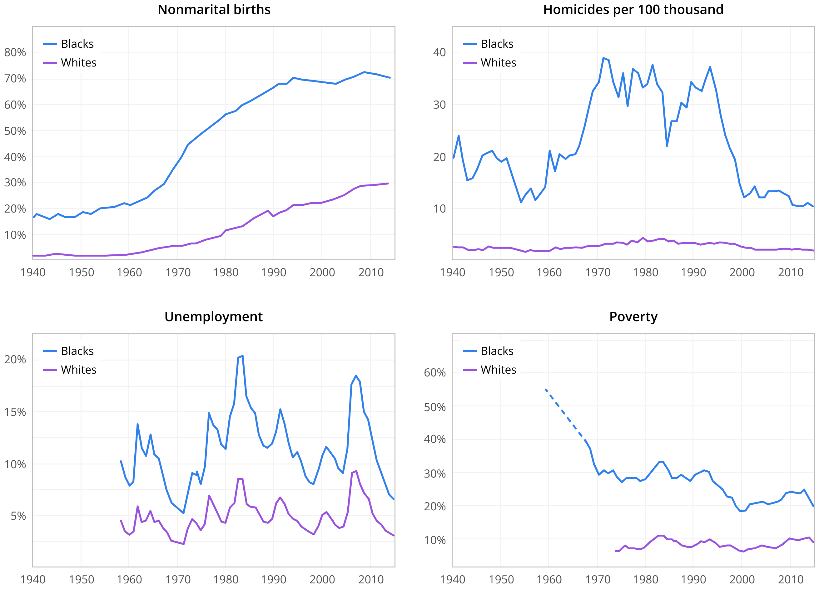 If before desegregation only 20% of black children were born to unmarried mothers, by the 1990s that number had climbed to 70%, where it still sits today. If in the 1960s about 7% of blacks were unemployed, then in the 1980s, 20% of them were out of work, every fifth person. If before equality the murder rate was 20 people per hundred thousand, then after it was abolished, it doubled to 40 murders.