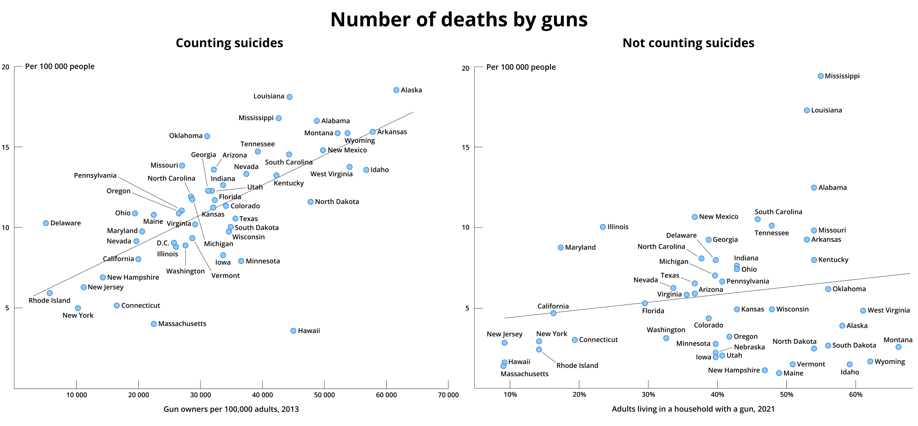 The reader may have seen how the number of murders depends on the level of gun ownership in each state. The chart shows a nice, clean linear relationship, which is why this picture is so popular in propaganda. But if you subtract suicides, the correlation becomes barely better than noise, and most states drop below 5 murders per 100,000 people.