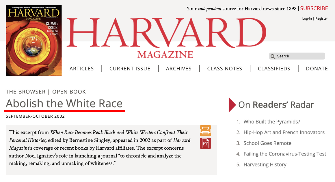 One of the most shocking articles published in Harvard Magazine in 2002 was titled: “Abolish the White Race.” Its author, Noel Ignatiev, a descendant of Russian émigrés, was a member of the Communist Party USA. He used to say that white identity is a tool of the bourgeoisie to divide the working class.