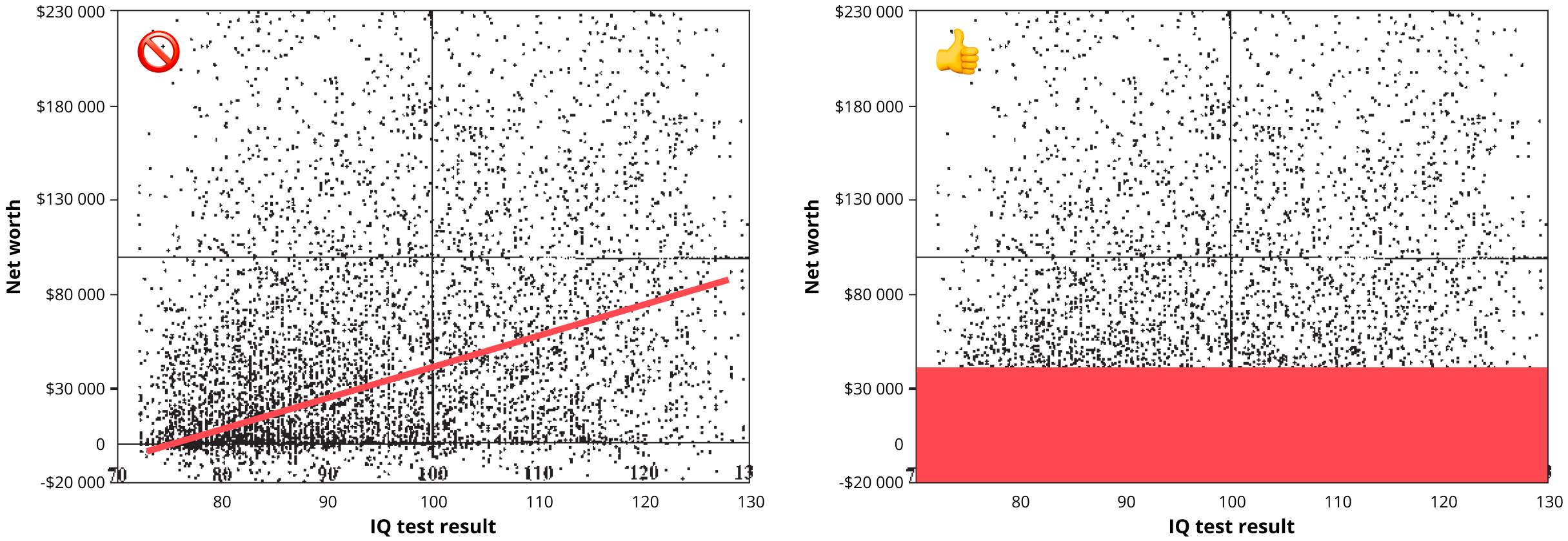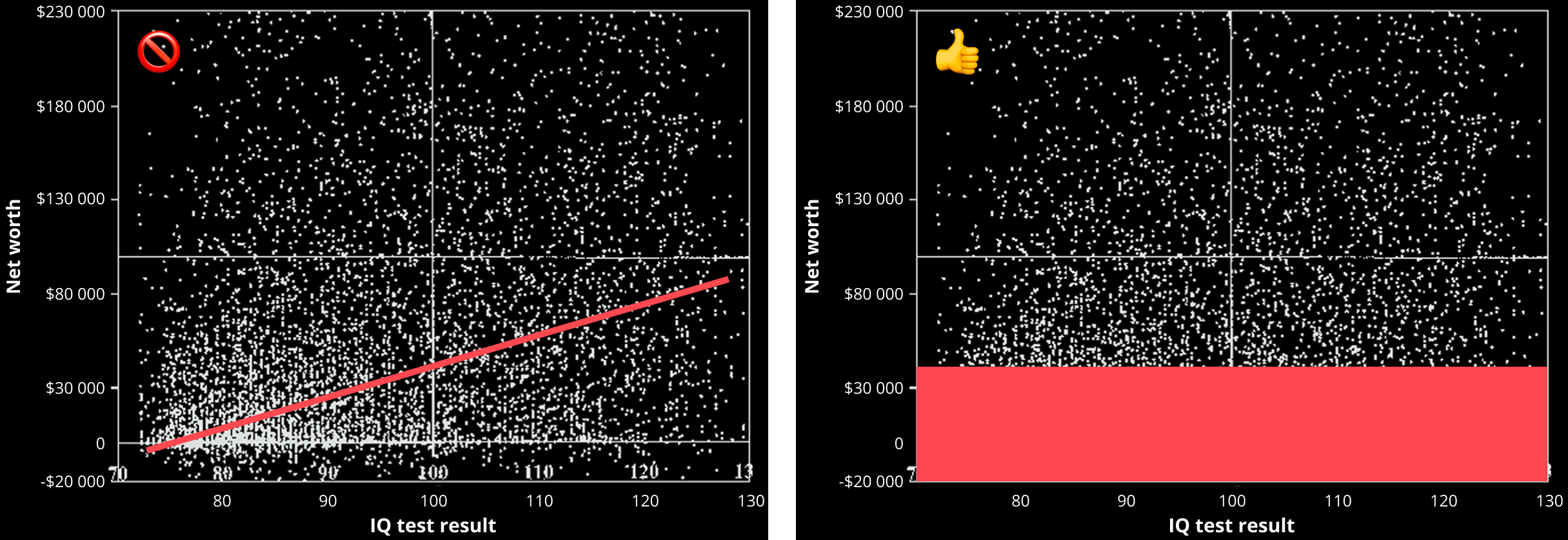 In reality, things are even worse with IQ tests. The problem is that the test produces an asymmetric distribution, meaning it behaves differently for low and high values. Below an IQ of 95, people really do get dramatically dumber, but above 105, there’s no difference in salary, wealth, or job complexity. Asymmetric distributions are not exactly something they teach in liberal arts colleges. So bloggers look at the left half of the graph, draw a trend line through the low-score area, and then mindlessly extend that line into the high-score area, even though there’s nothing there but noise.