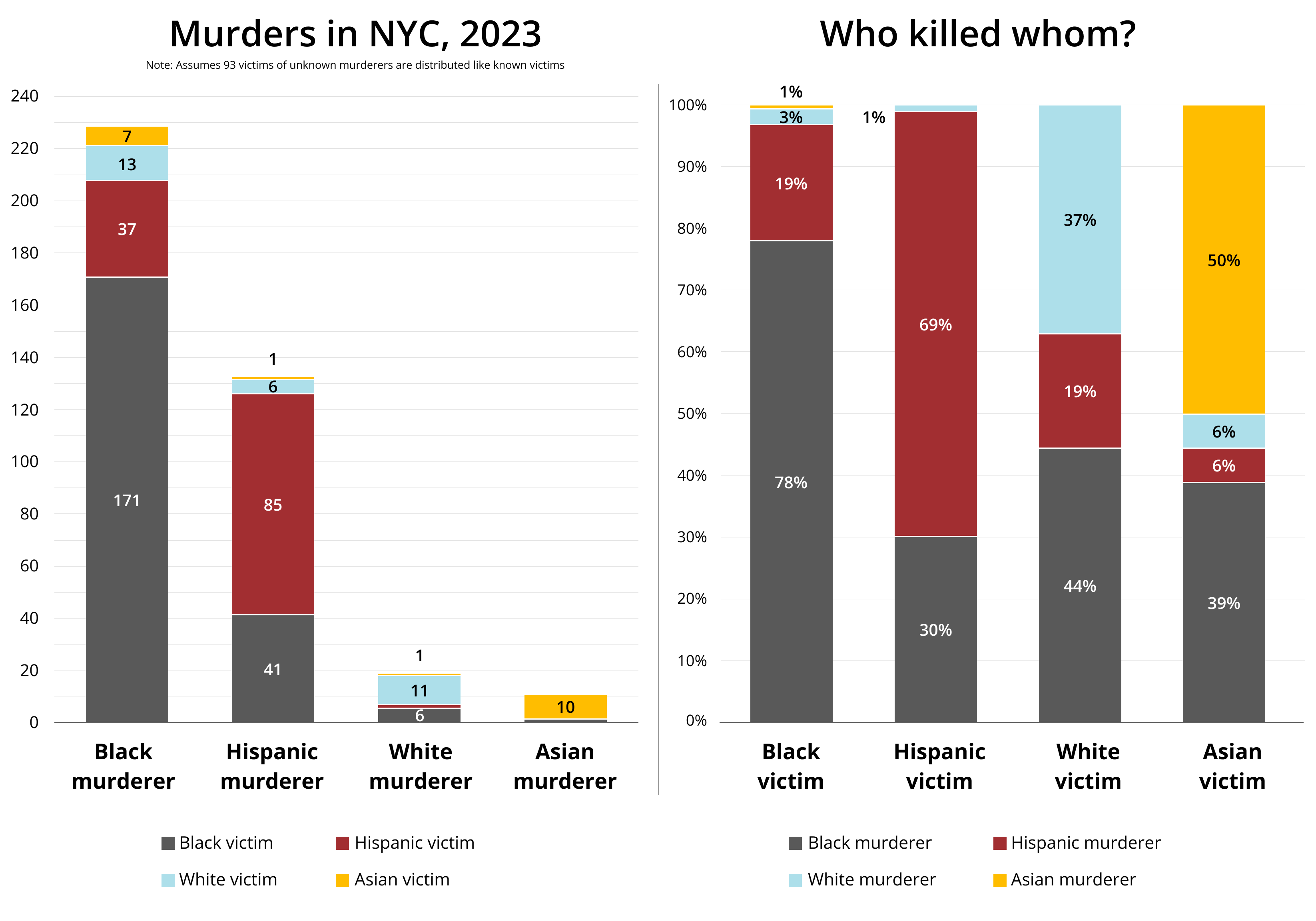 Blacks commit more than half of all crimes in the U.S. For example, in 2023 in New York, they accounted for 58% of murders. At the same time, black people make up just over 13% of the U.S. population. If you adjust for proportions, it turns out that blacks committed 12 times more murders than whites.