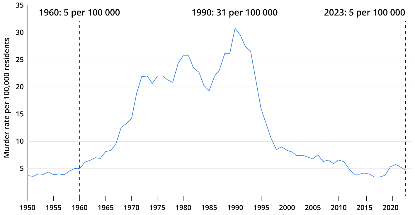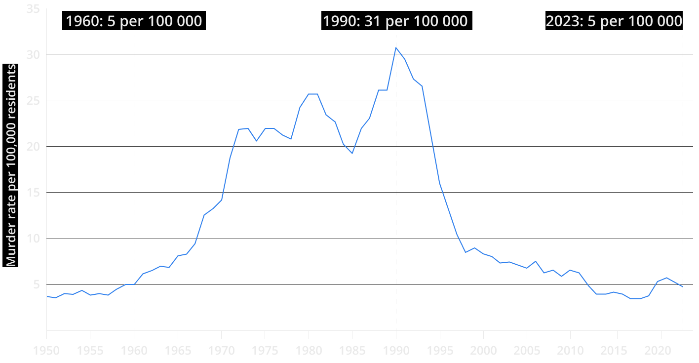 So, in recent years, even in the U.S. capital, Washington, D.C., there was a spike up to 40 murders per 100,000 people; in Detroit, the rate reached 50, in St. Louis 70, and in New Orleans 72. And levels like that are nothing unusual for America. The country has basically been living in the “wild nineties” for half a century now.