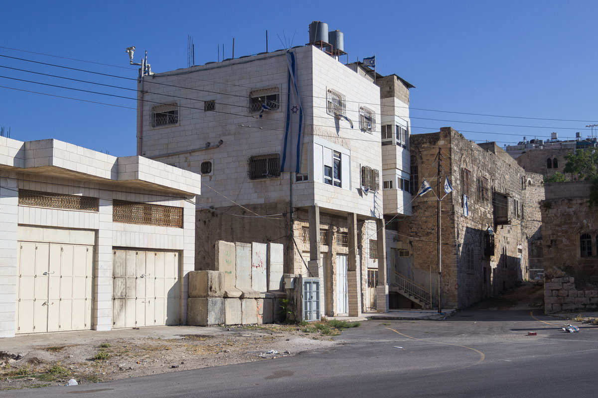 In front of the Cave of the Patriarchs stands a police station with Israeli flags.