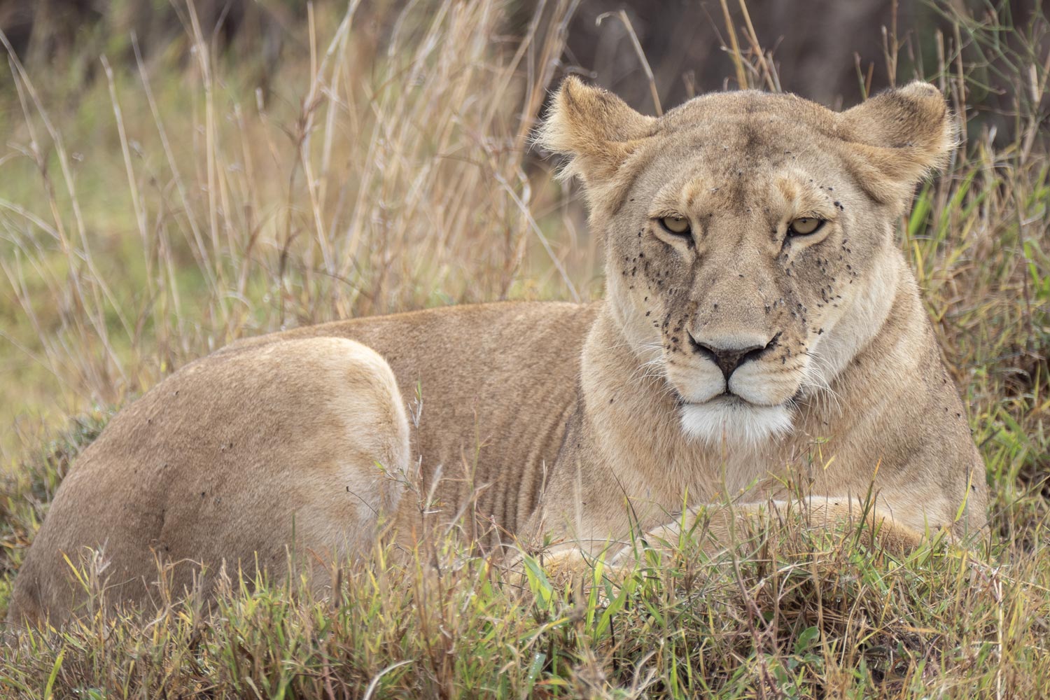 It seems that this theory is a bit of a stretch. But flies are a real problem for animals in Africa. For example, there might be a lioness lying peacefully on a hill.